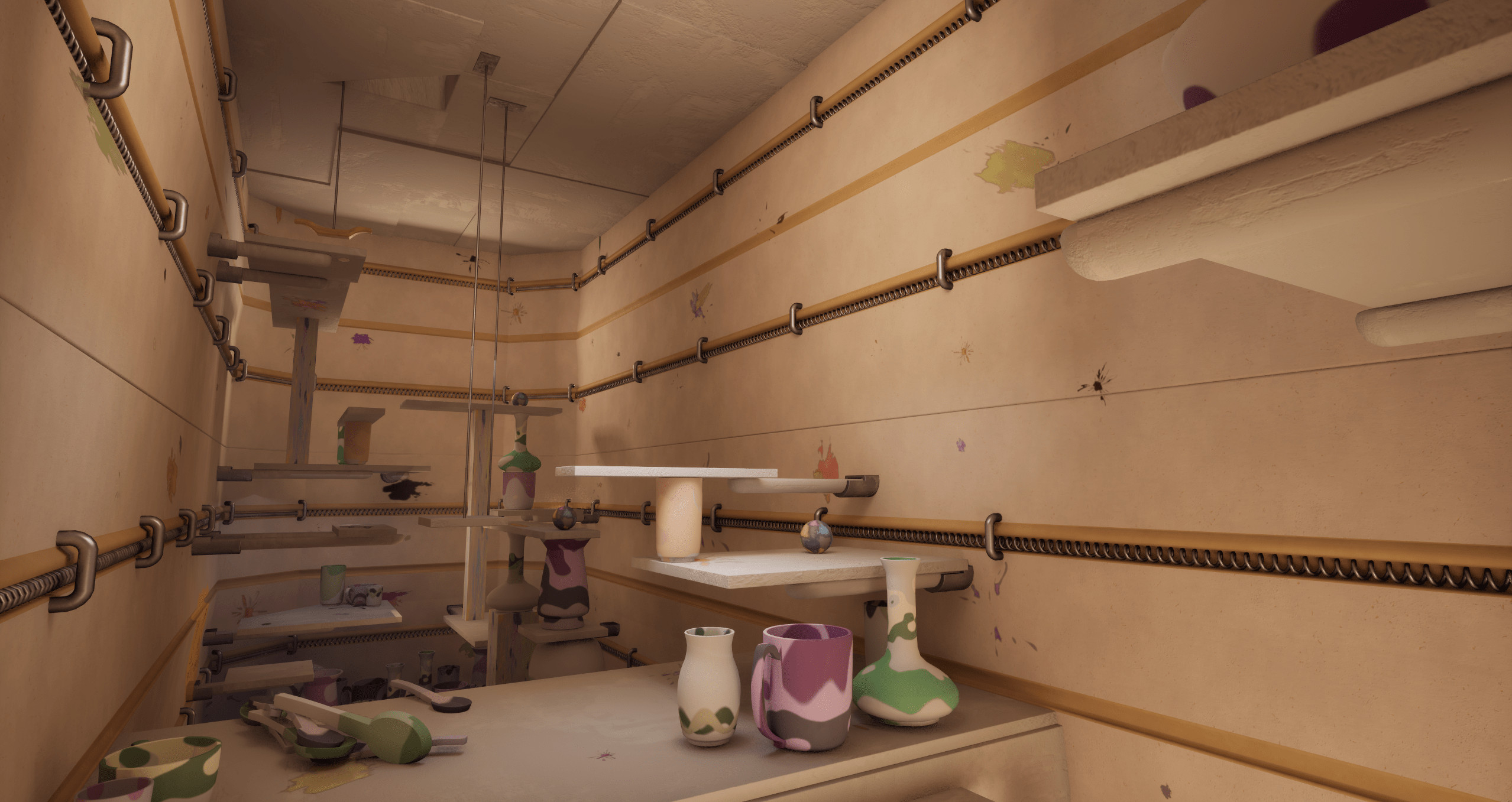 Using clay mallets as hammers, smash pottery (or your buddy!) to traverse and discover solutions to puzzles. Break bisqueware, unlock platforms, and push bombs around to create chain reactions that reveal a path up the kiln.